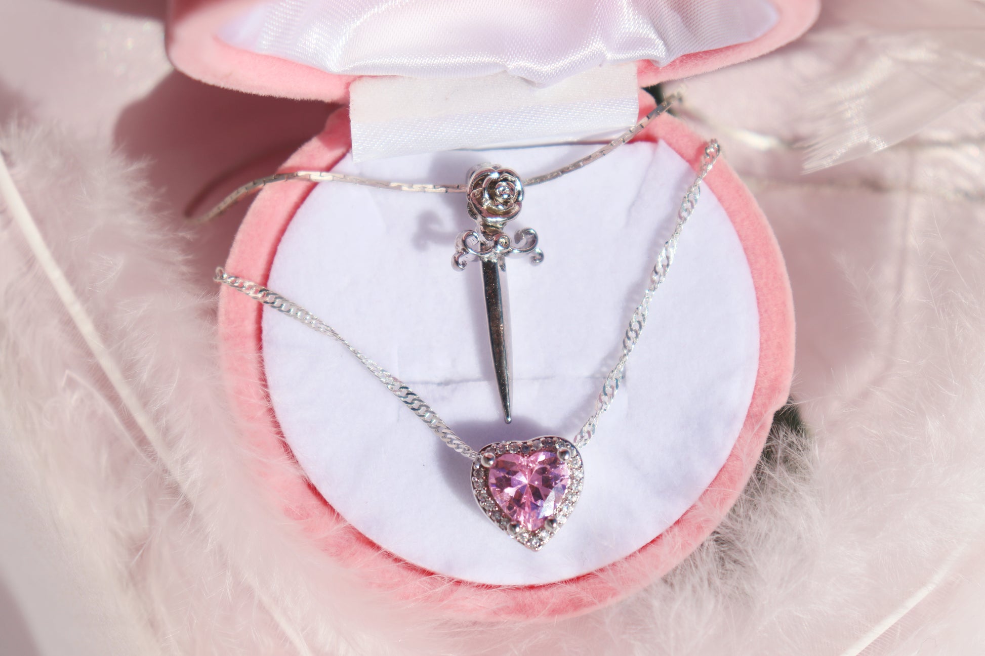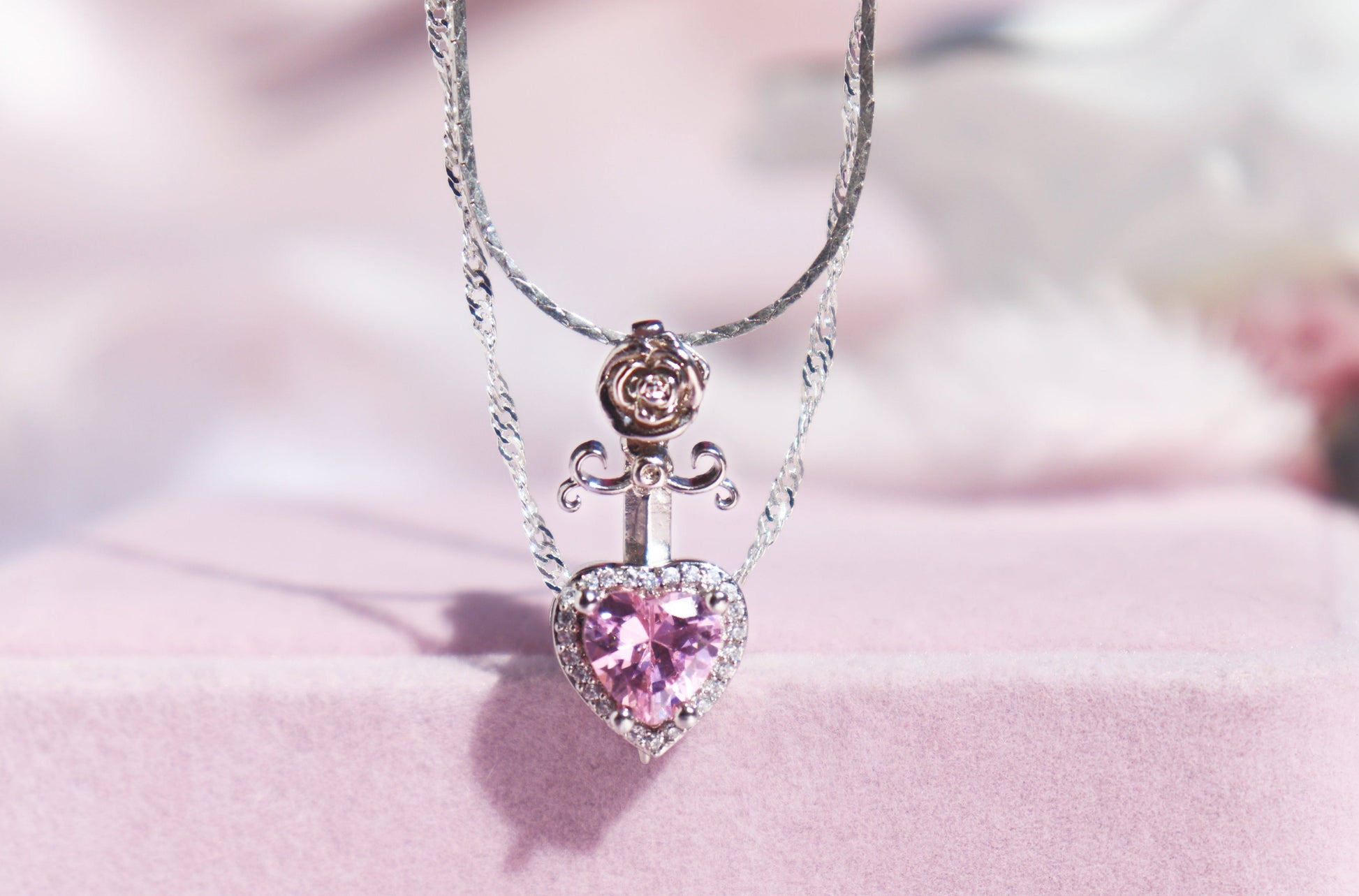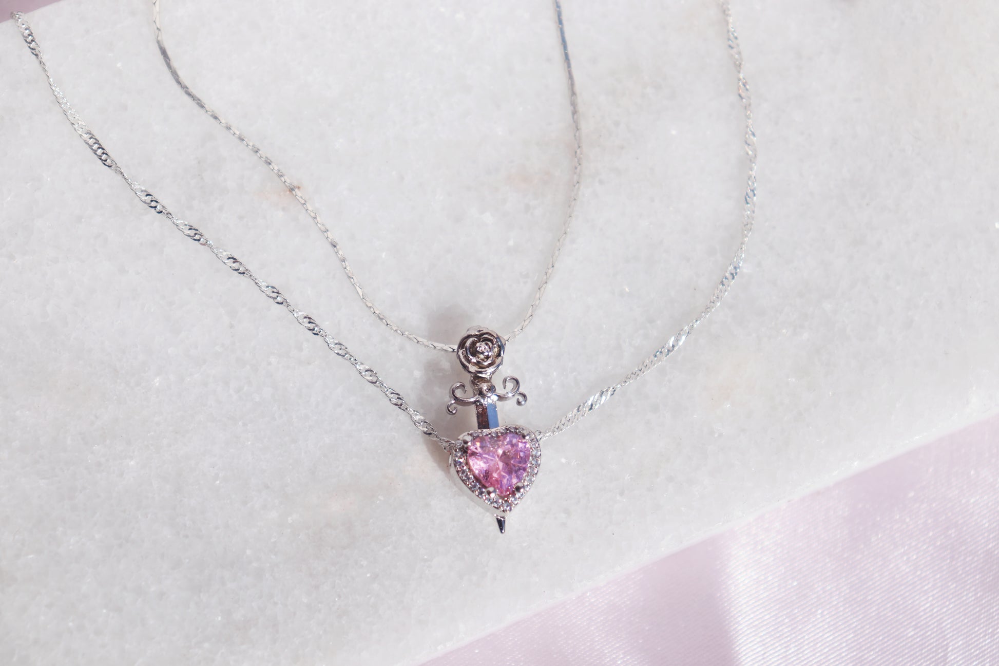 💖 This sweet and elegant necklace, inspired by Snow White and the Huntsman, is adorned with charming details that symbolize romance. The pink heart stone sparkles as the sweetest expression of love, while the delicate sword motif stands out as a symbol of strength and protection. The unique harmony of the heart and sword represents a bond that is both loving and strong. Whether worn with a friend or a loved one, this special piece adds a magical and sweet touch to any moment. It's the perfect way to express your love or friendship in the most delightful manner.