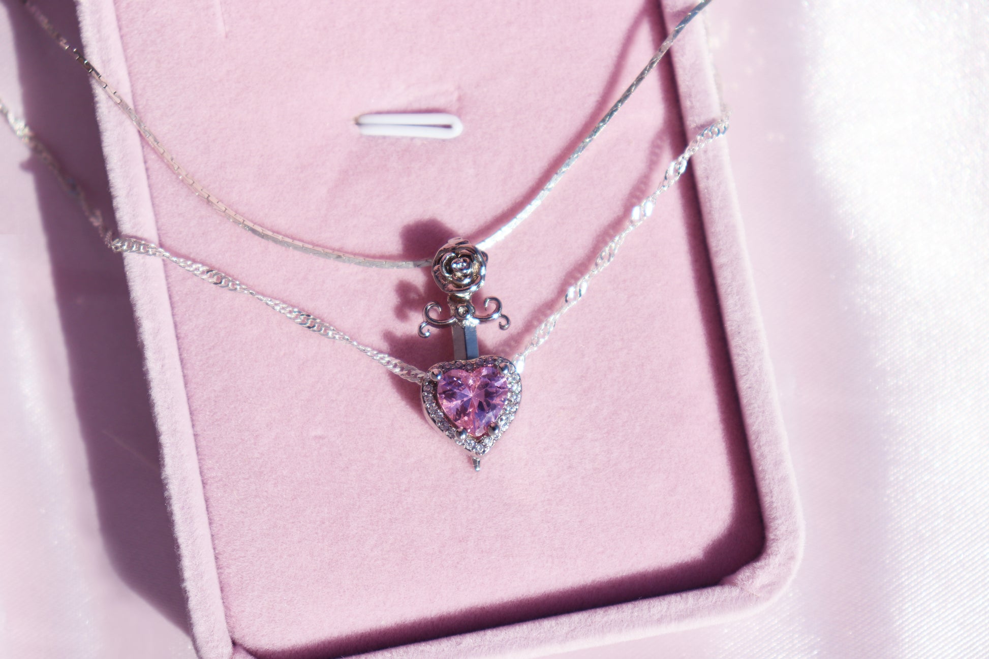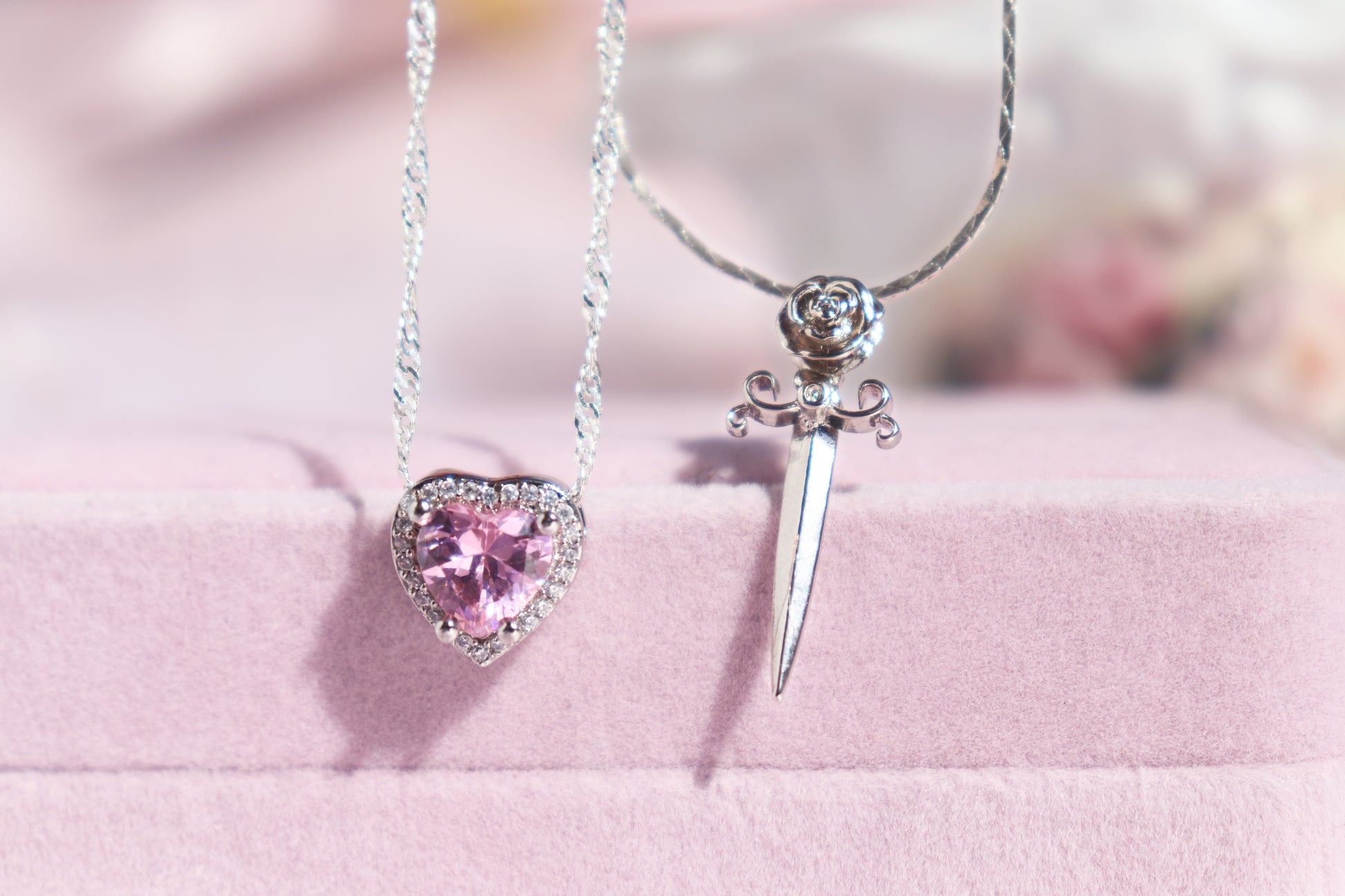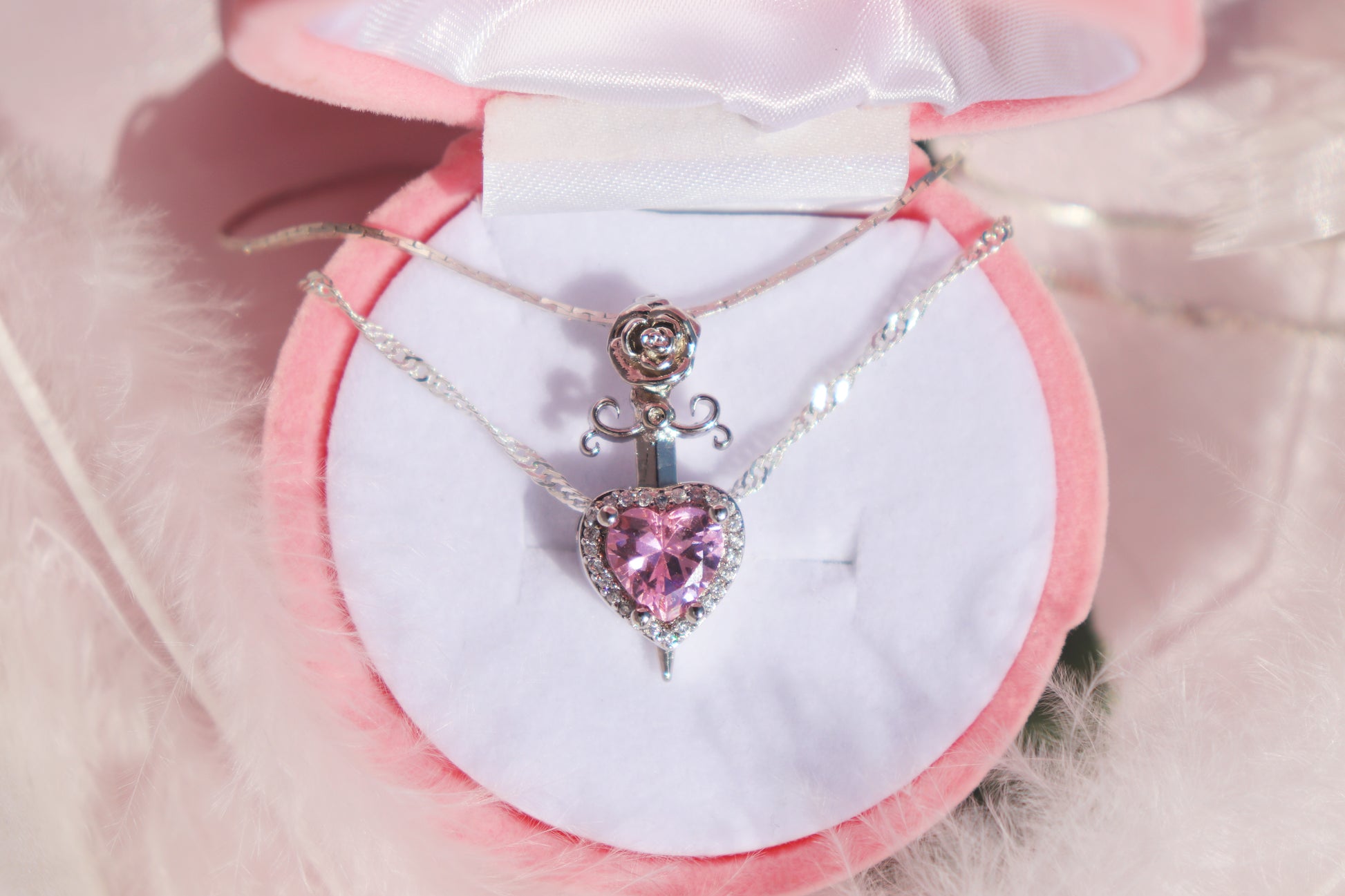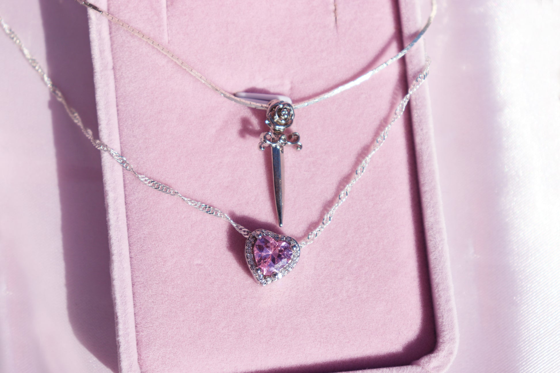 💖 This sweet and elegant necklace, inspired by Snow White and the Huntsman, is adorned with charming details that symbolize romance. The pink heart stone sparkles as the sweetest expression of love, while the delicate sword motif stands out as a symbol of strength and protection. The unique harmony of the heart and sword represents a bond that is both loving and strong. Whether worn with a friend or a loved one, this special piece adds a magical and sweet touch to any moment. It's the perfect way to express your love or friendship in the most delightful manner.