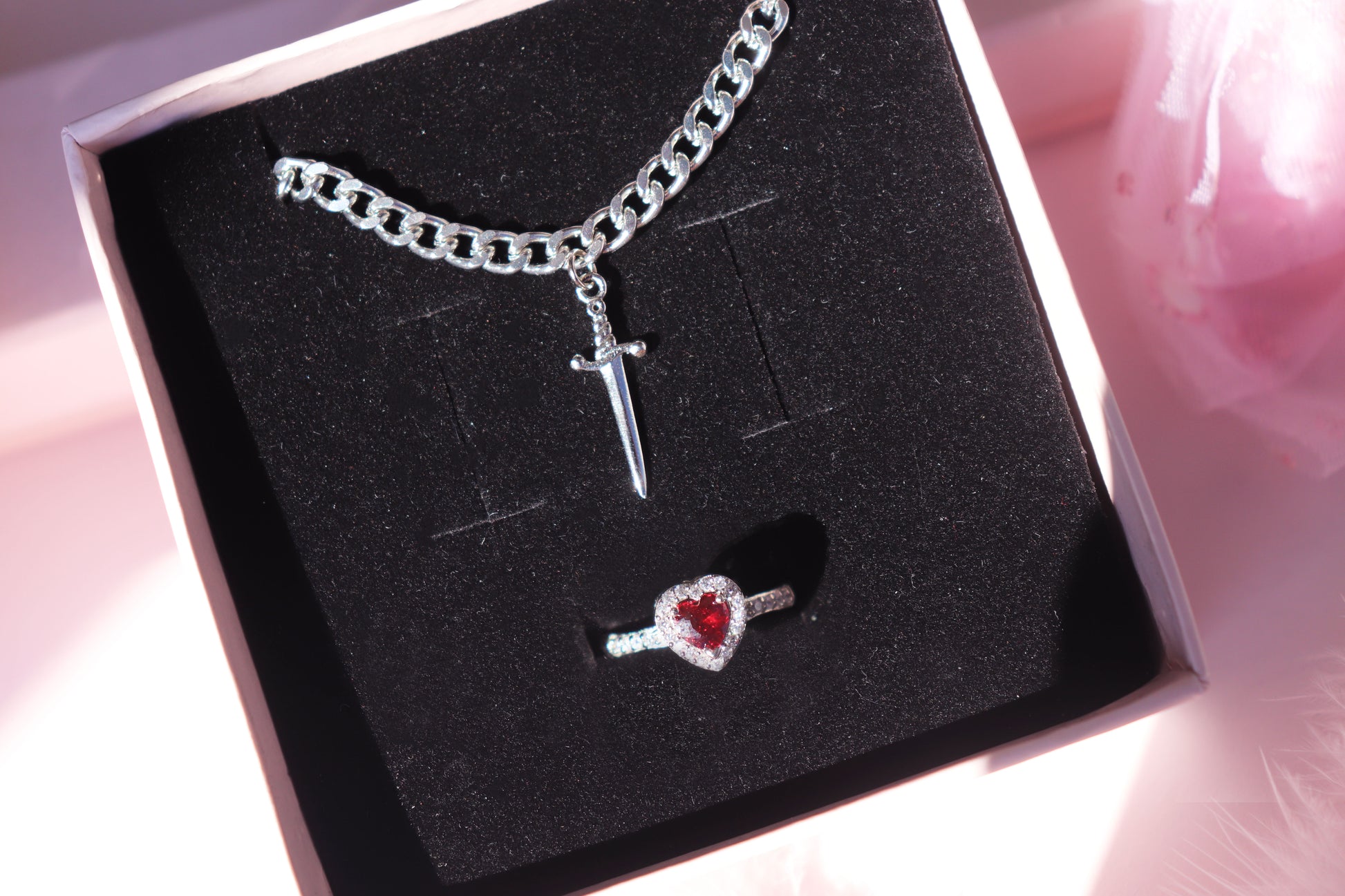 ❤️ The red heart ring carries the purest form of love, while the sword charm bracelet symbolizes protecting that love. A sweet and meaningful combo! Isn't it just the perfect match?