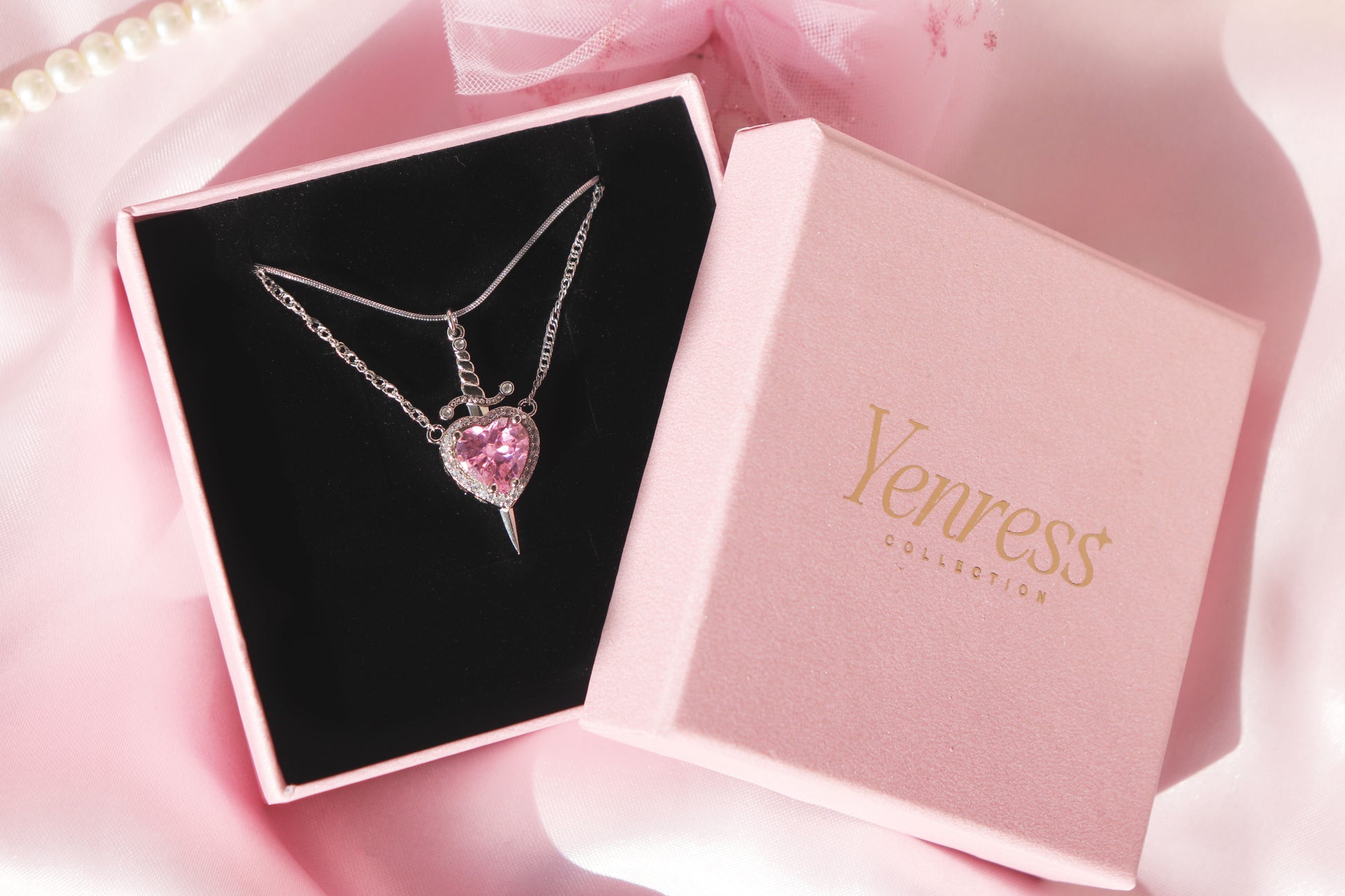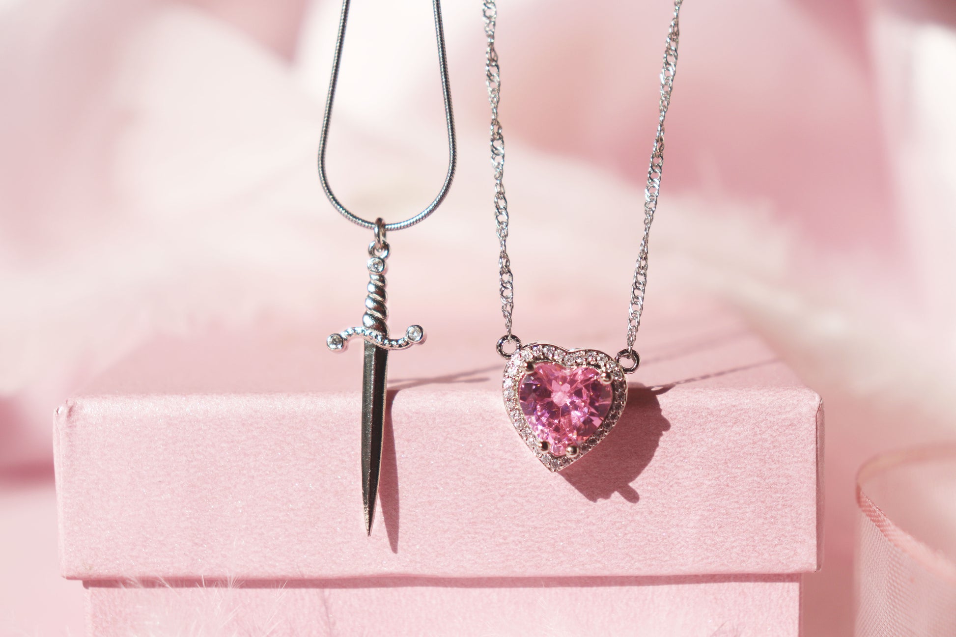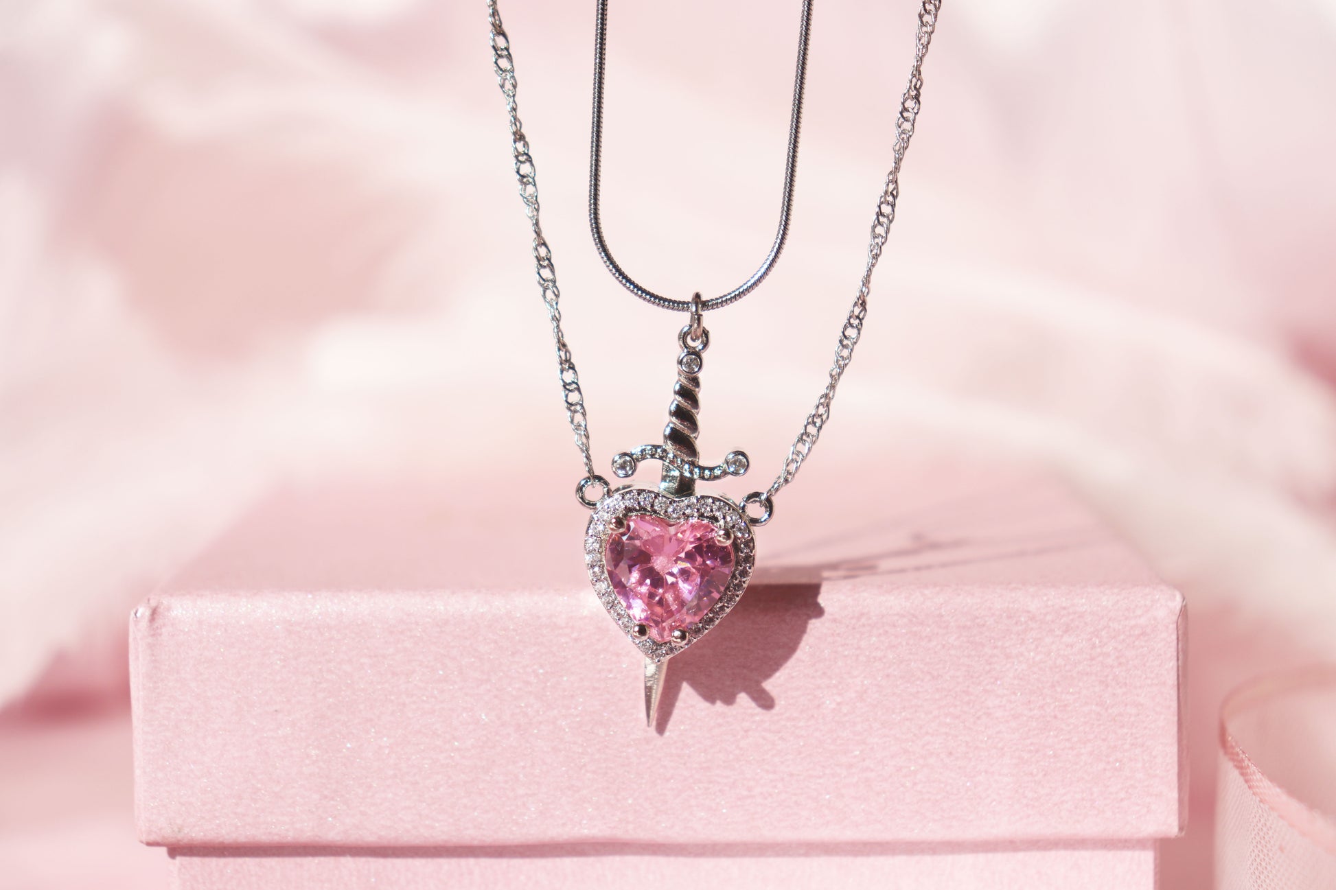 💖 This sweet and elegant necklace, inspired by Snow White and the Huntsman, is adorned with charming details that symbolize romance. The pink heart stone sparkles as the sweetest expression of love, while the delicate sword motif stands out as a symbol of strength and protection. The unique harmony of the heart and sword represents a bond that is both loving and strong. Whether worn with a friend or a loved one, this special piece adds a magical and sweet touch to any moment. It's the perfect way to express your love or friendship in the most delightful manner.