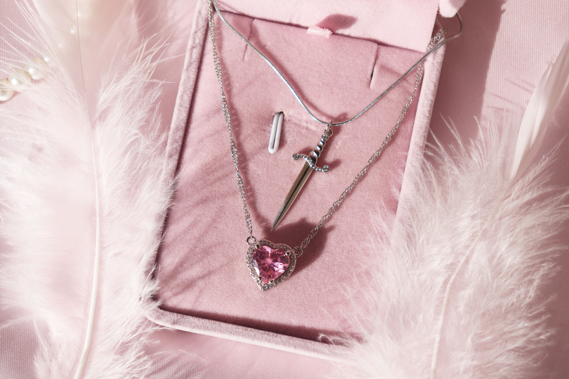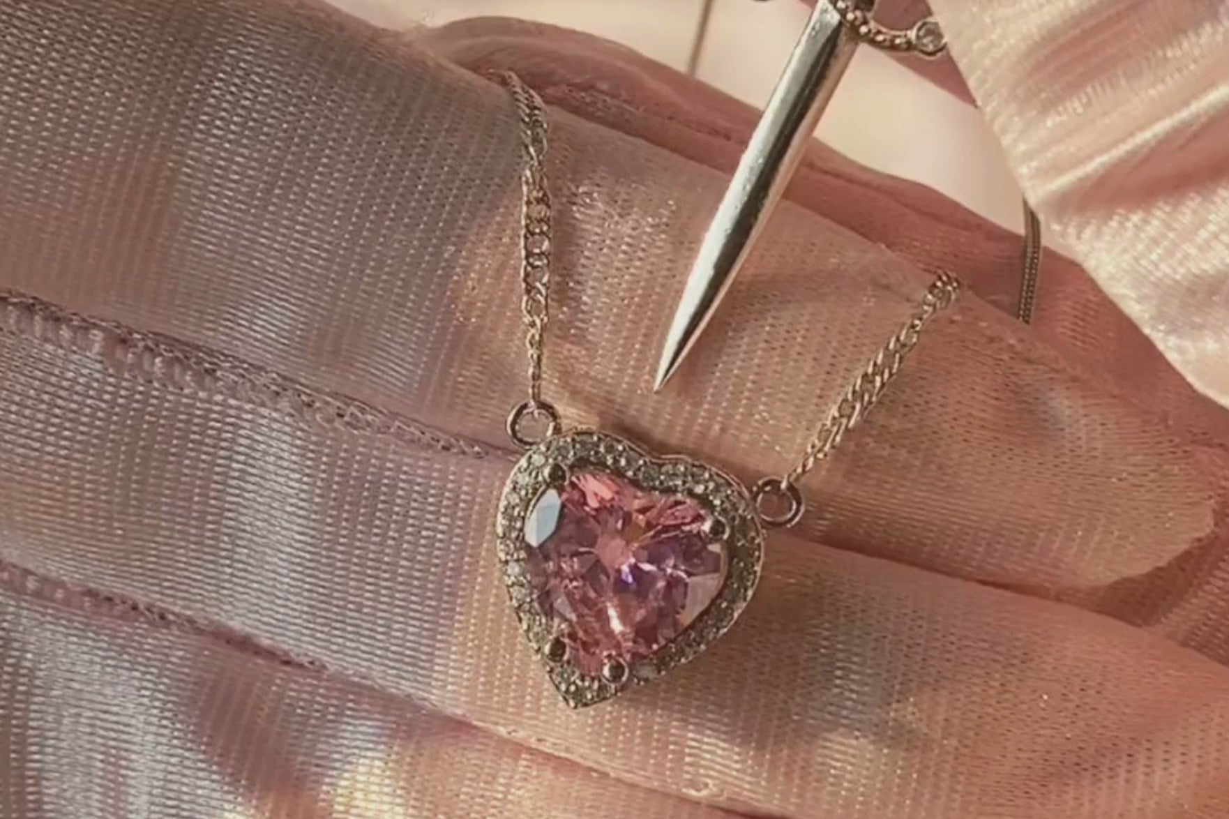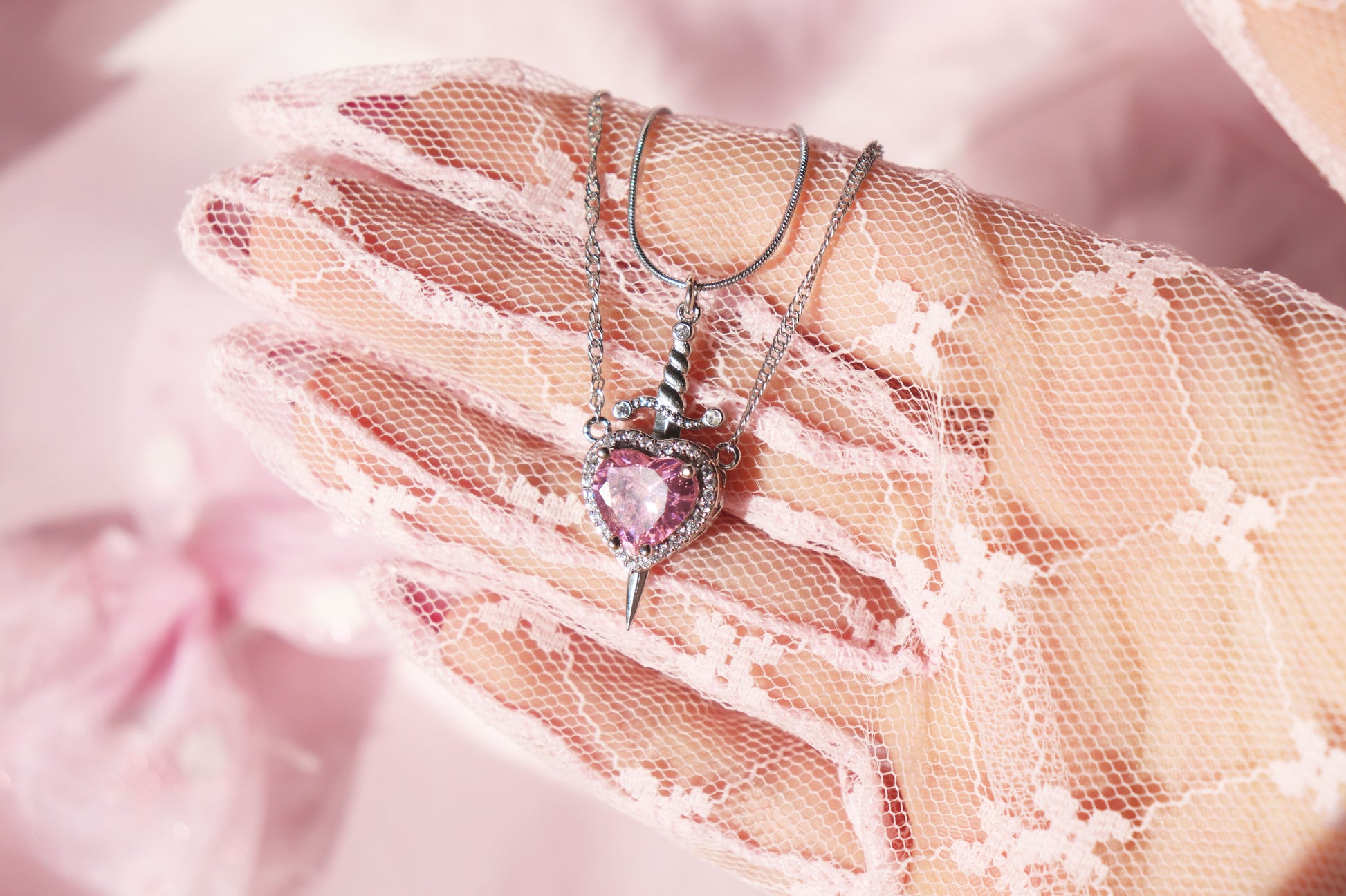💖 This sweet and elegant necklace, inspired by Snow White and the Huntsman, is adorned with charming details that symbolize romance. The pink heart stone sparkles as the sweetest expression of love, while the delicate sword motif stands out as a symbol of strength and protection. The unique harmony of the heart and sword represents a bond that is both loving and strong. Whether worn with a friend or a loved one, this special piece adds a magical and sweet touch to any moment. It's the perfect way to express your love or friendship in the most delightful manner.