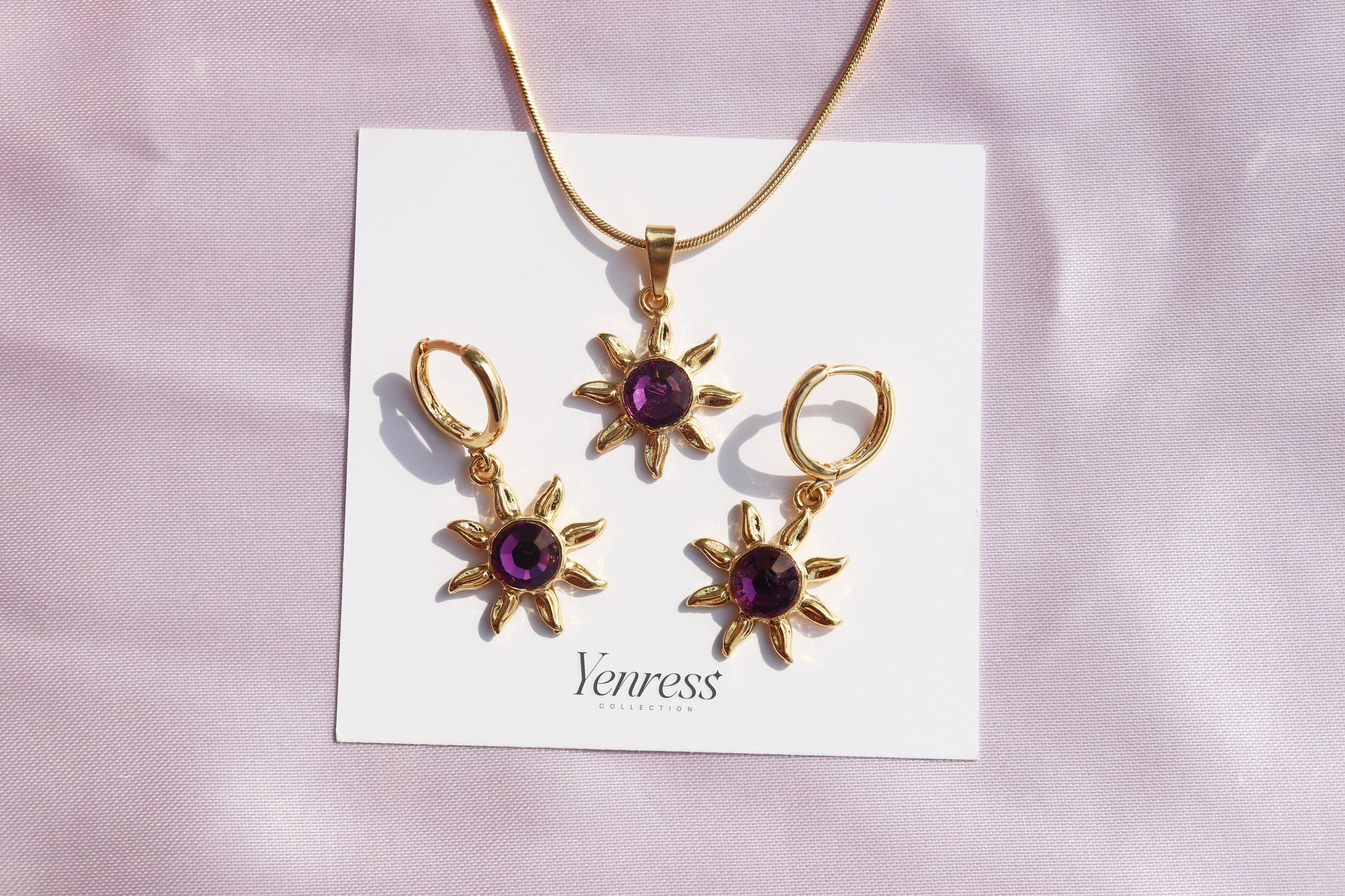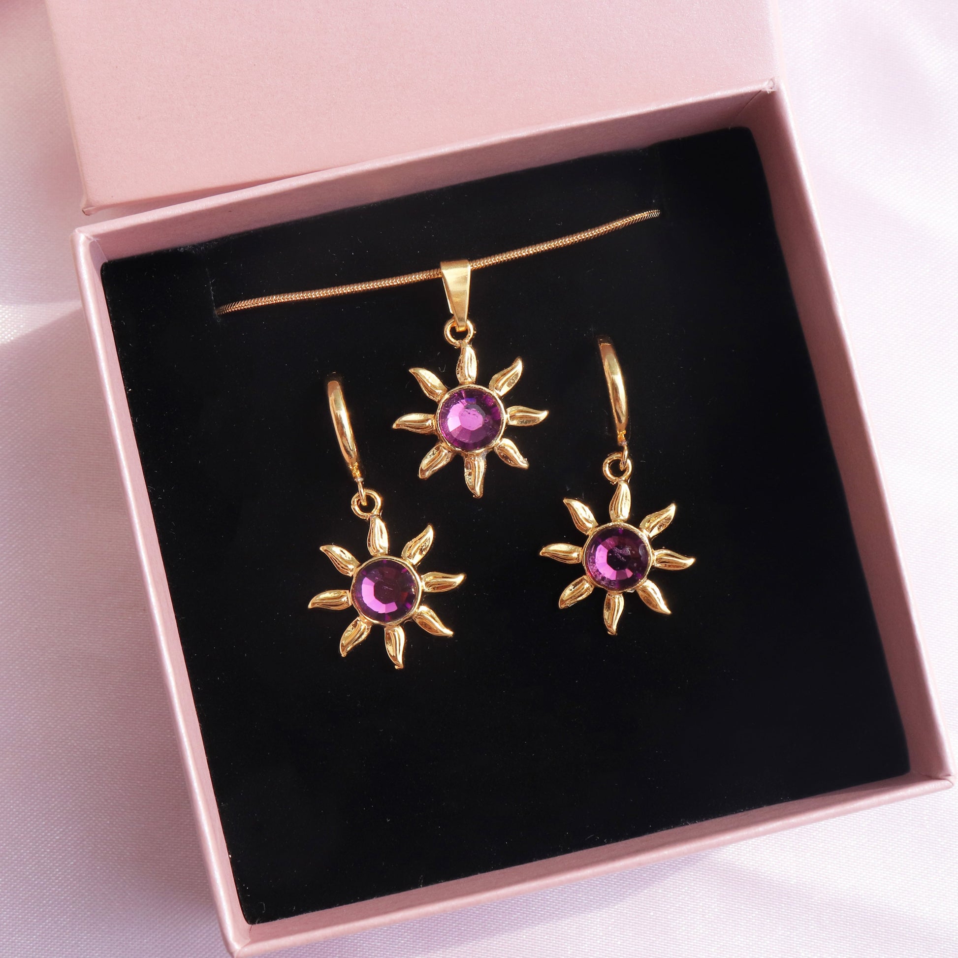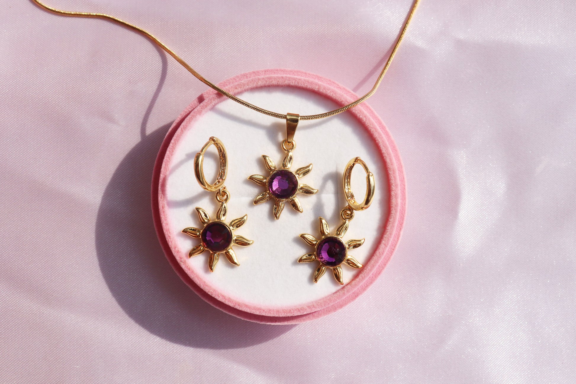 ☀️💜 This exquisite jewelry set captures the essence of Rapunzel's journey as she discovers her true self and embraces her destiny. The centerpiece of this necklace is a dazzling gemstone, reminiscent of the lanterns that lit up the night sky on Rapunzel's birthday. Its deep purple hue symbolizes the depth of her courage and the power of her dreams. Encircling the purple stone are delicate golden sun symbol that held the secret to Rapunzel's miraculous healing powers. Let the "Rapunzel Sun Set" be a beacon of light and inspiration in your life, just as the floating lanterns illuminated the path to Rapunzel's dreams.