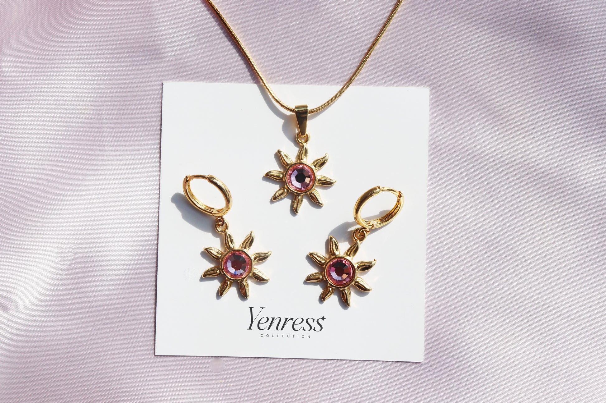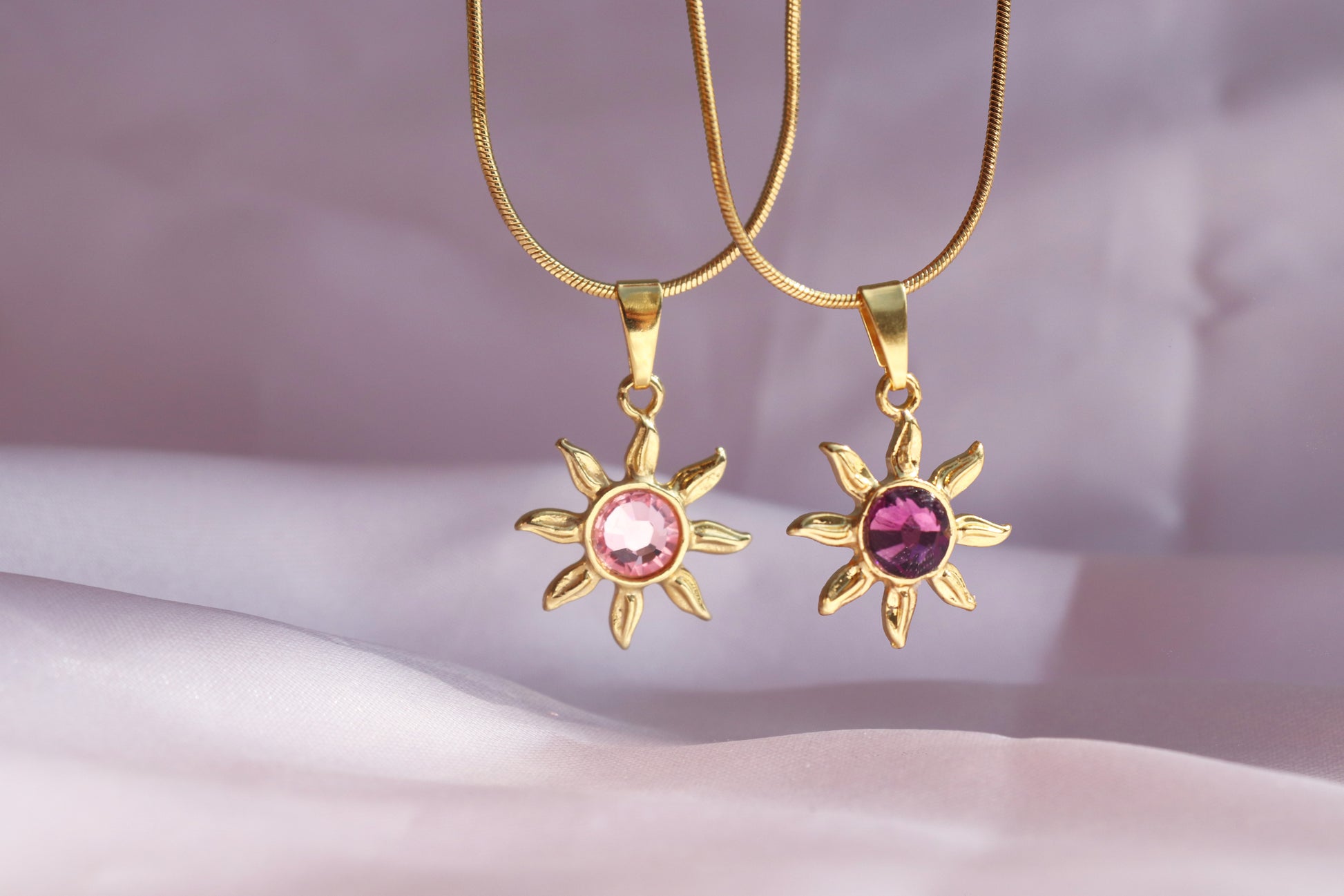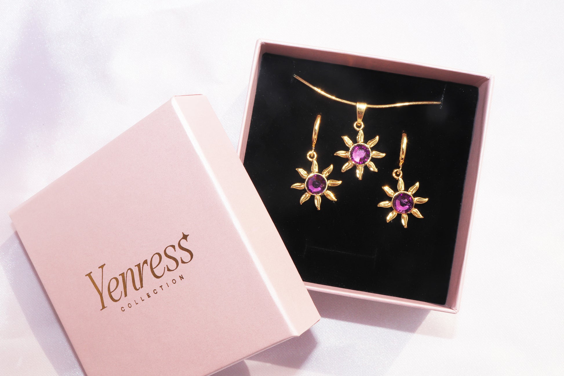 ☀️💜 This exquisite jewelry set captures the essence of Rapunzel's journey as she discovers her true self and embraces her destiny. The centerpiece of this necklace is a dazzling gemstone, reminiscent of the lanterns that lit up the night sky on Rapunzel's birthday. Its deep purple hue symbolizes the depth of her courage and the power of her dreams. Encircling the purple stone are delicate golden sun symbol that held the secret to Rapunzel's miraculous healing powers. Let the "Rapunzel Sun Set" be a beacon of light and inspiration in your life, just as the floating lanterns illuminated the path to Rapunzel's dreams.
