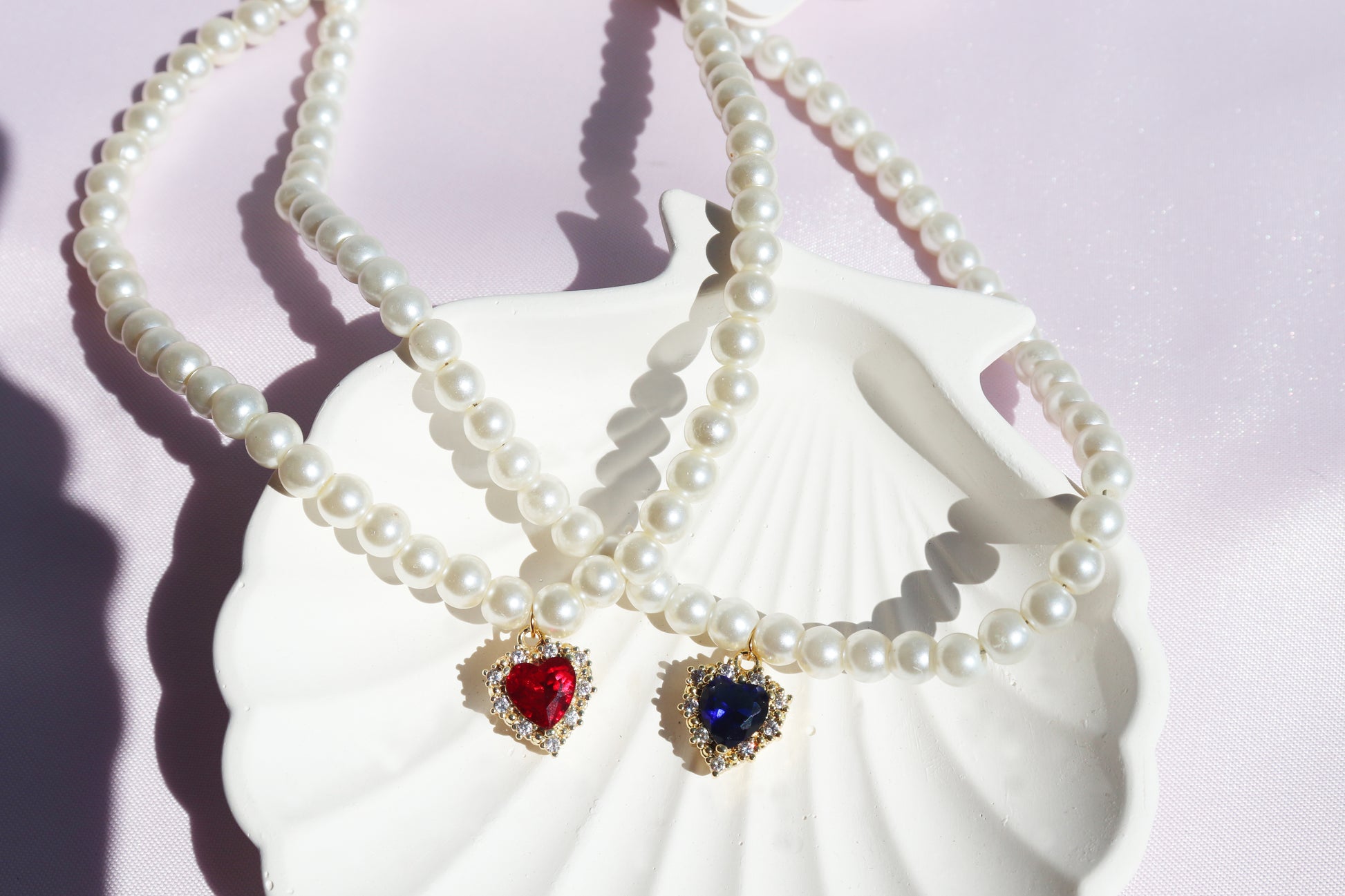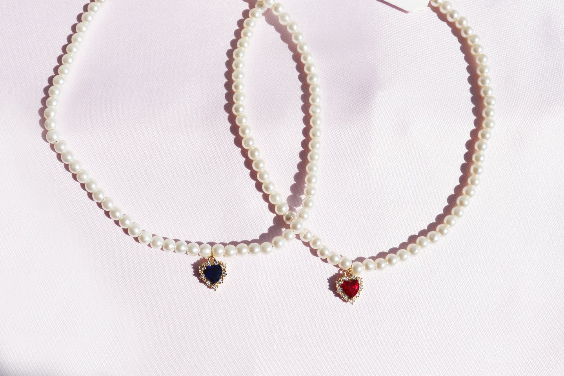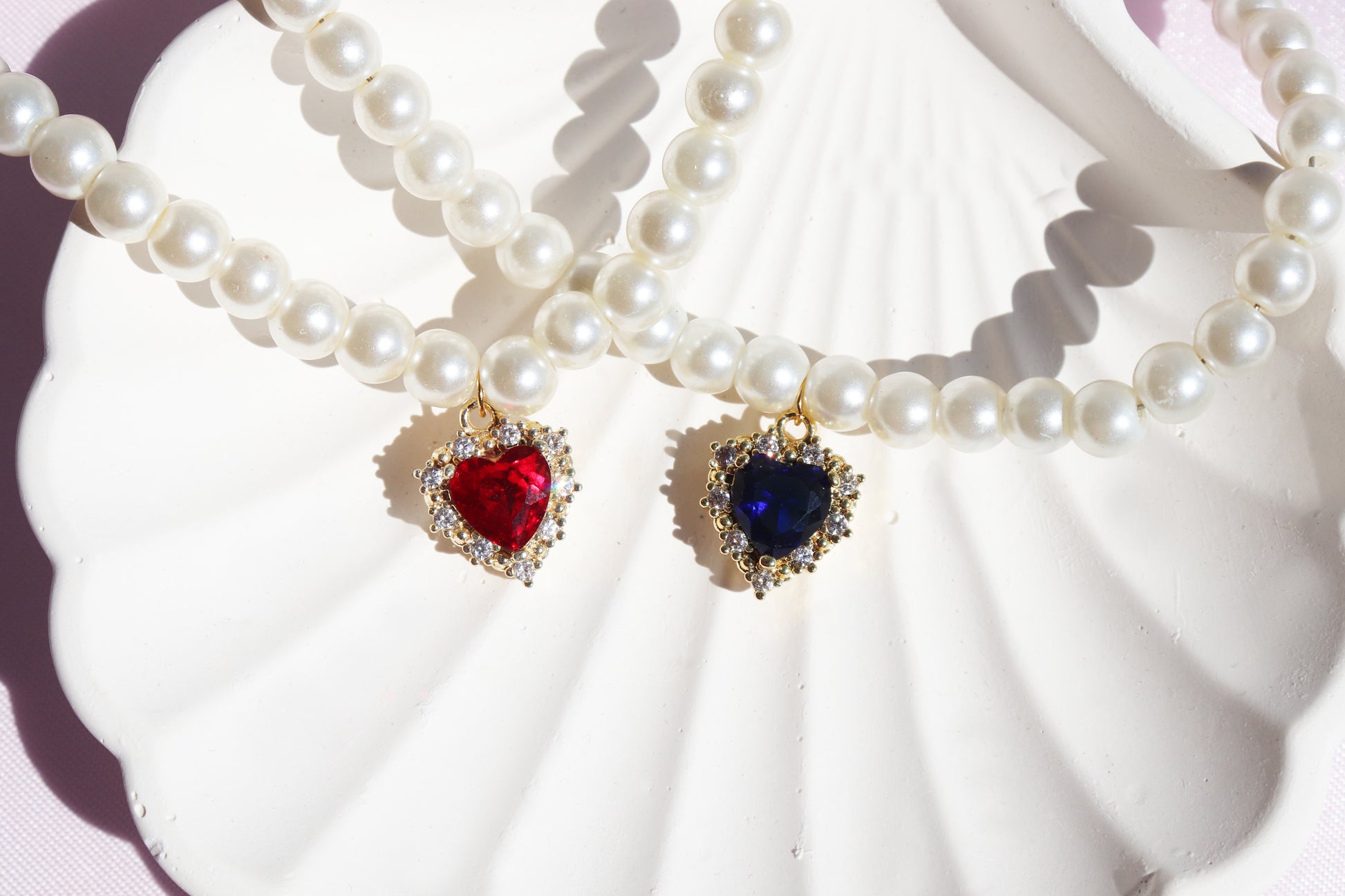 🌟 Elevate your jewelry collection with our exquisite Glass Pearl Necklace featuring a heart pendant in captivating ruby and sapphire hues. This necklace beautifully combines the timeless elegance of glass pearls with the rich allure of gemstone-inspired colors.