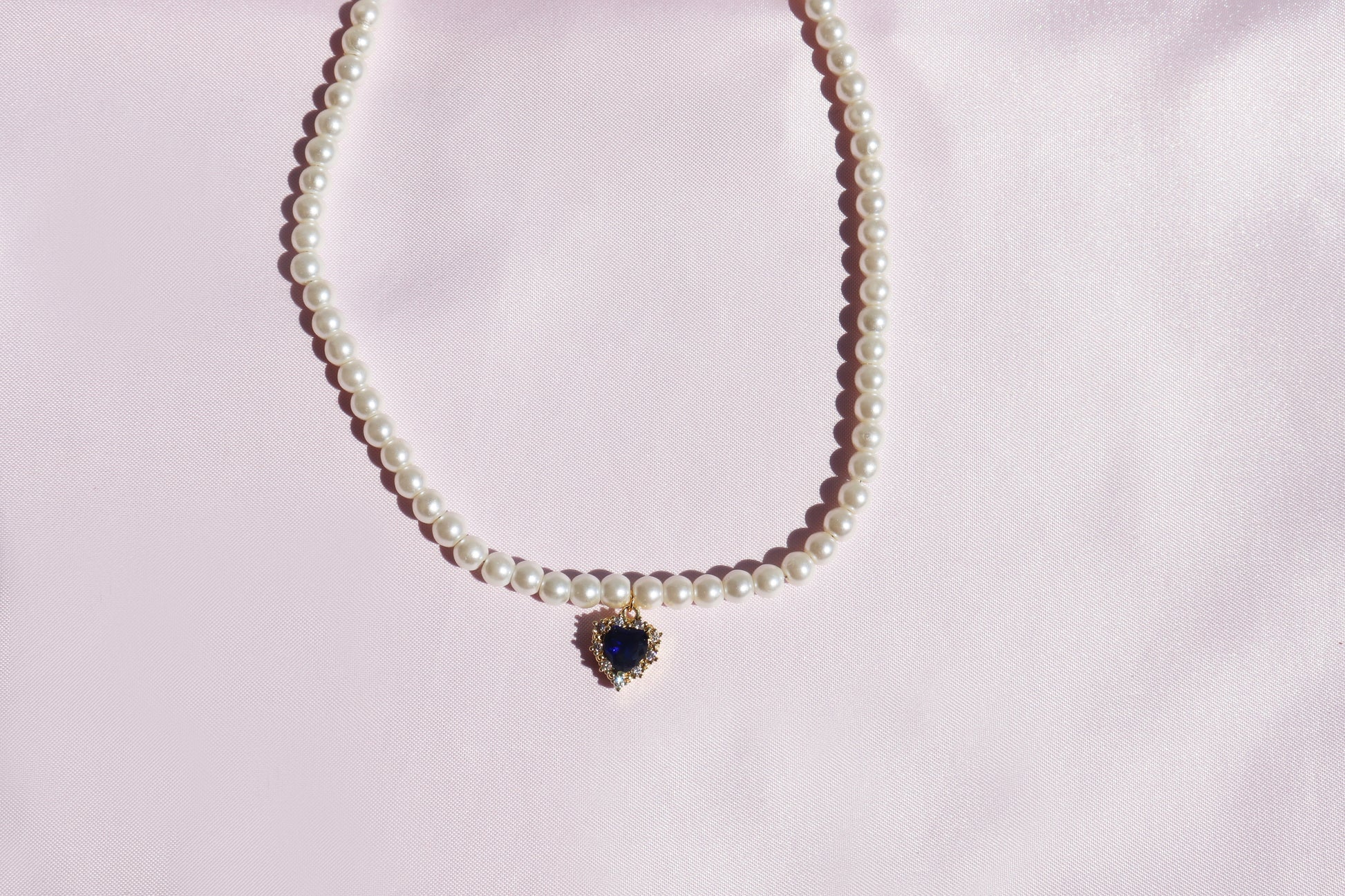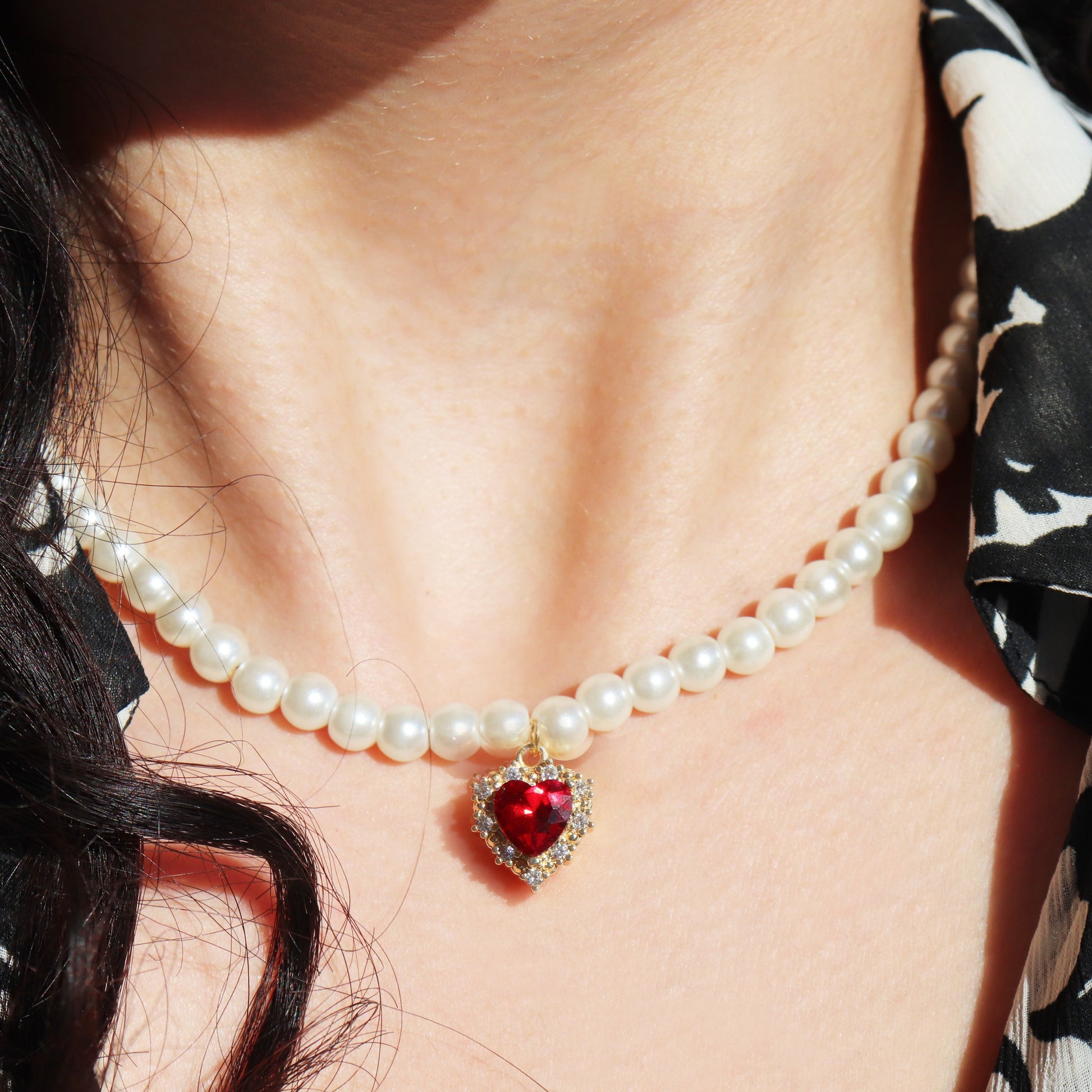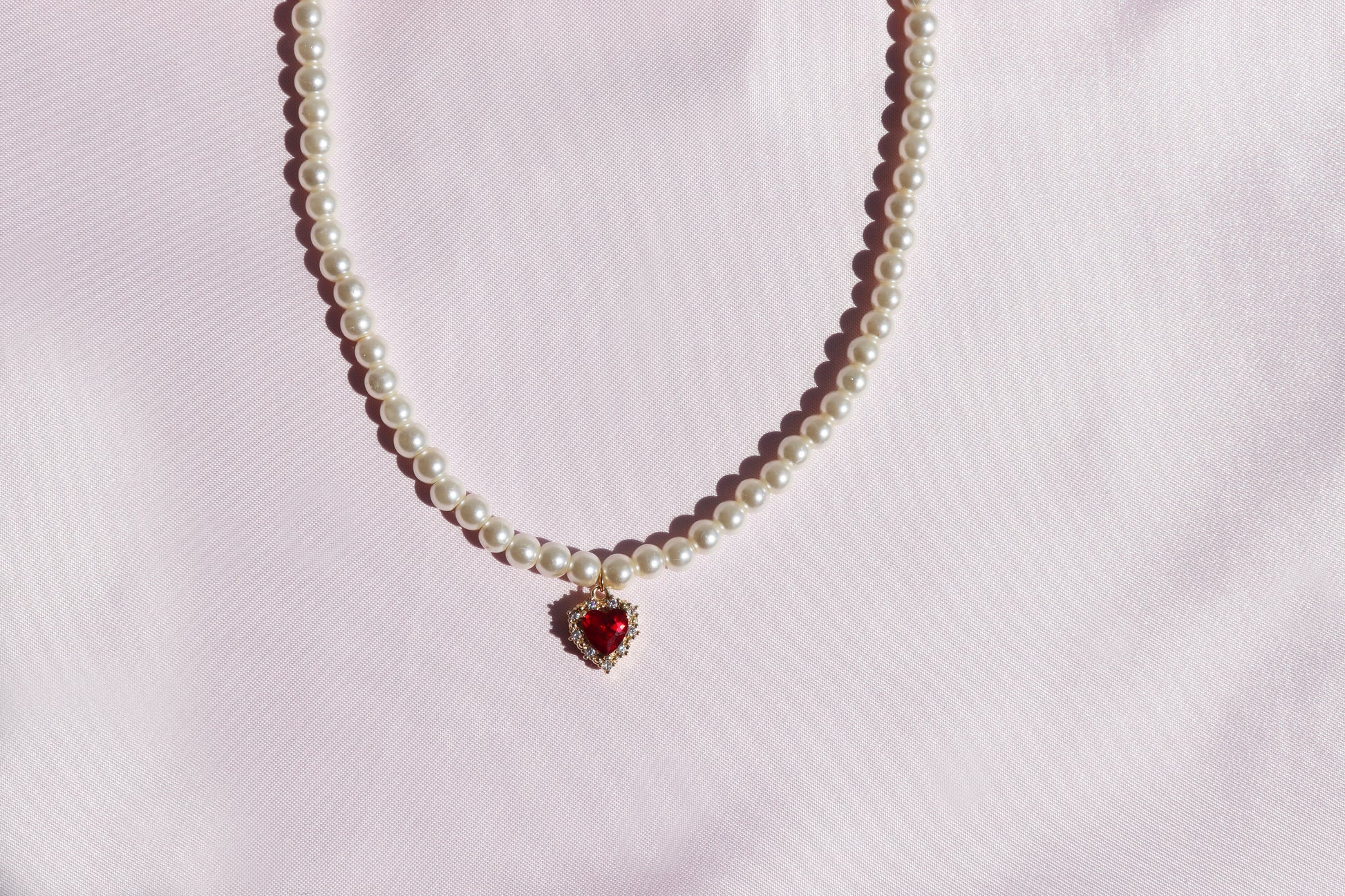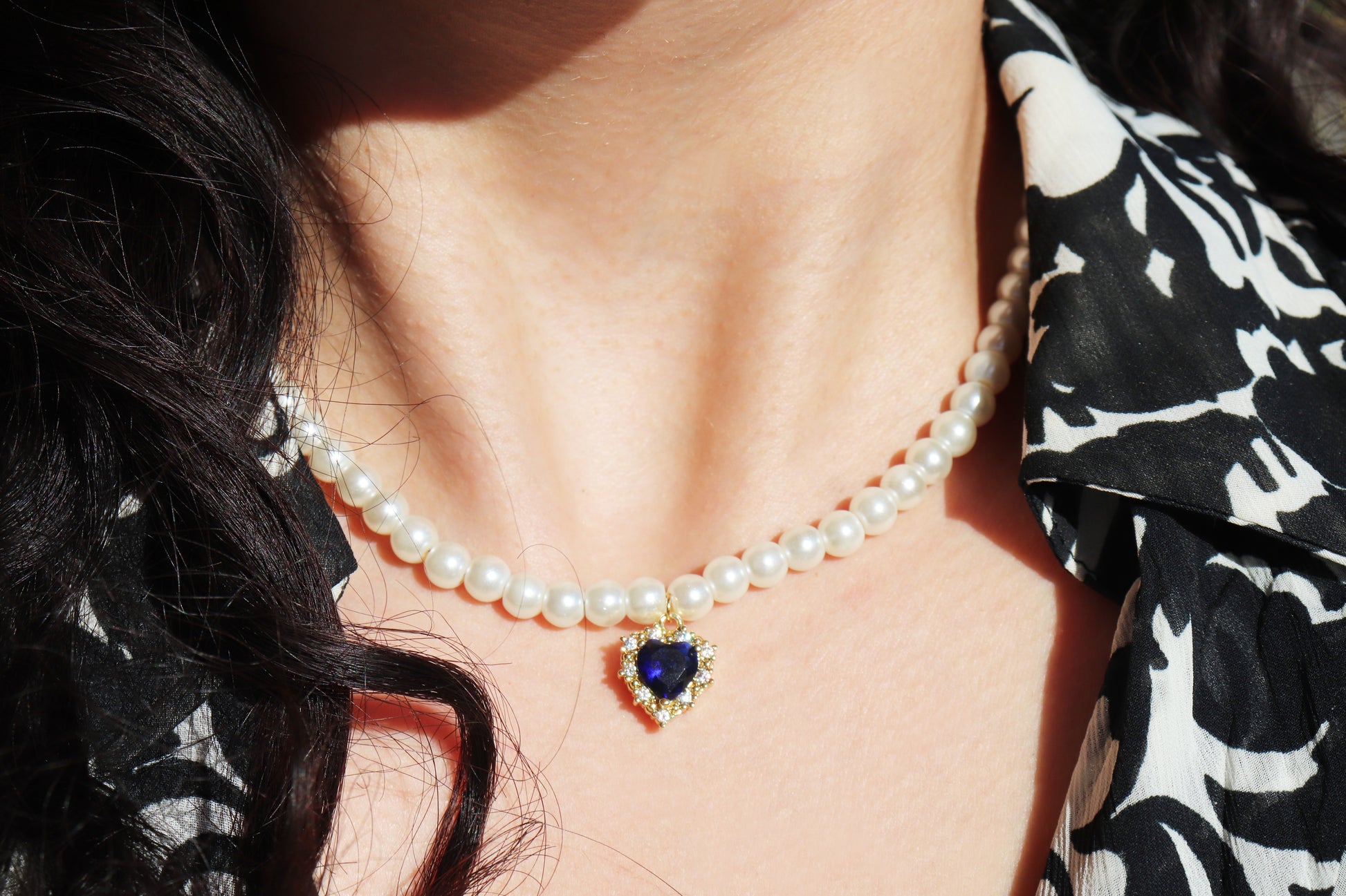 🌟 Elevate your jewelry collection with our exquisite Glass Pearl Necklace featuring a heart pendant in captivating ruby and sapphire hues. This necklace beautifully combines the timeless elegance of glass pearls with the rich allure of gemstone-inspired colors.